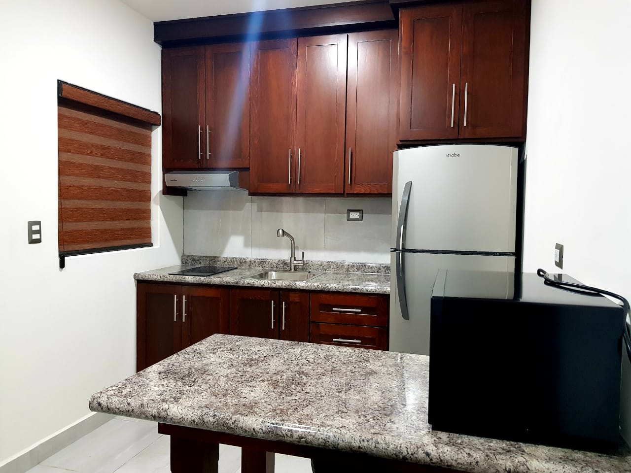 - Cocina equipada con refrigerador de 14 pies, parrilla eléctrica, horno de microondas, cafetera, licuadora, vajilla y cubiertos, ideal para preparar tus alimentos con total comodidad.